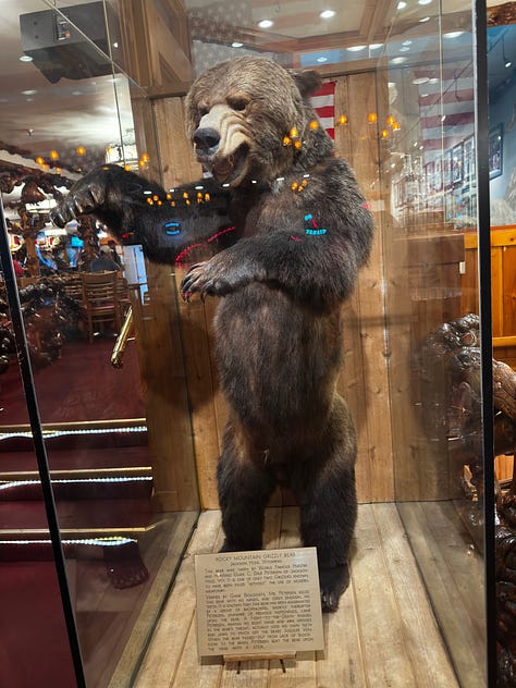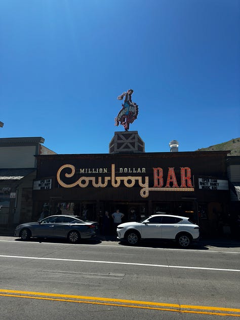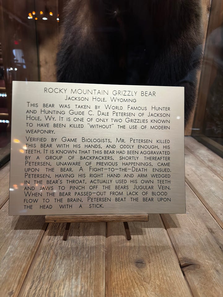 We strolled around Jackson Hole town center. Roadhouse Brew pub and the Million Dollar Cowboy Bar. They had a display of a bear that Jackson Hole resident C. Dale Petersen killed with his bare hands and teeth. Read the plaque for details. Pretty gruesome. I actually found it kind of sad. Then, we came across a place called Wyoming Whisky tasting bar where they were giving out bourbon from free. I took a sip. My buddies took multiple sips. Something you’d never see on the East Coast.